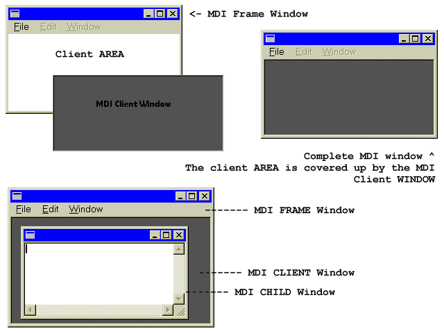 In MDI terms, your main window is called the Frame, this is probably the only window you would have in a SDI (Single Document Interface) program. In MDI there is an additional window, called the MDI Client Window which is a child of your Frame window. Unlike the Client Area it is a complete and separated window all on it's own, it has a client area of it's own and probably a few pixels for a border. |