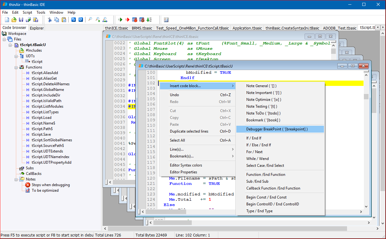 thinAir is thinBasic official editor containing thinDebug (thinBasic debugger) and thinBundle (thinBasic executable creator).